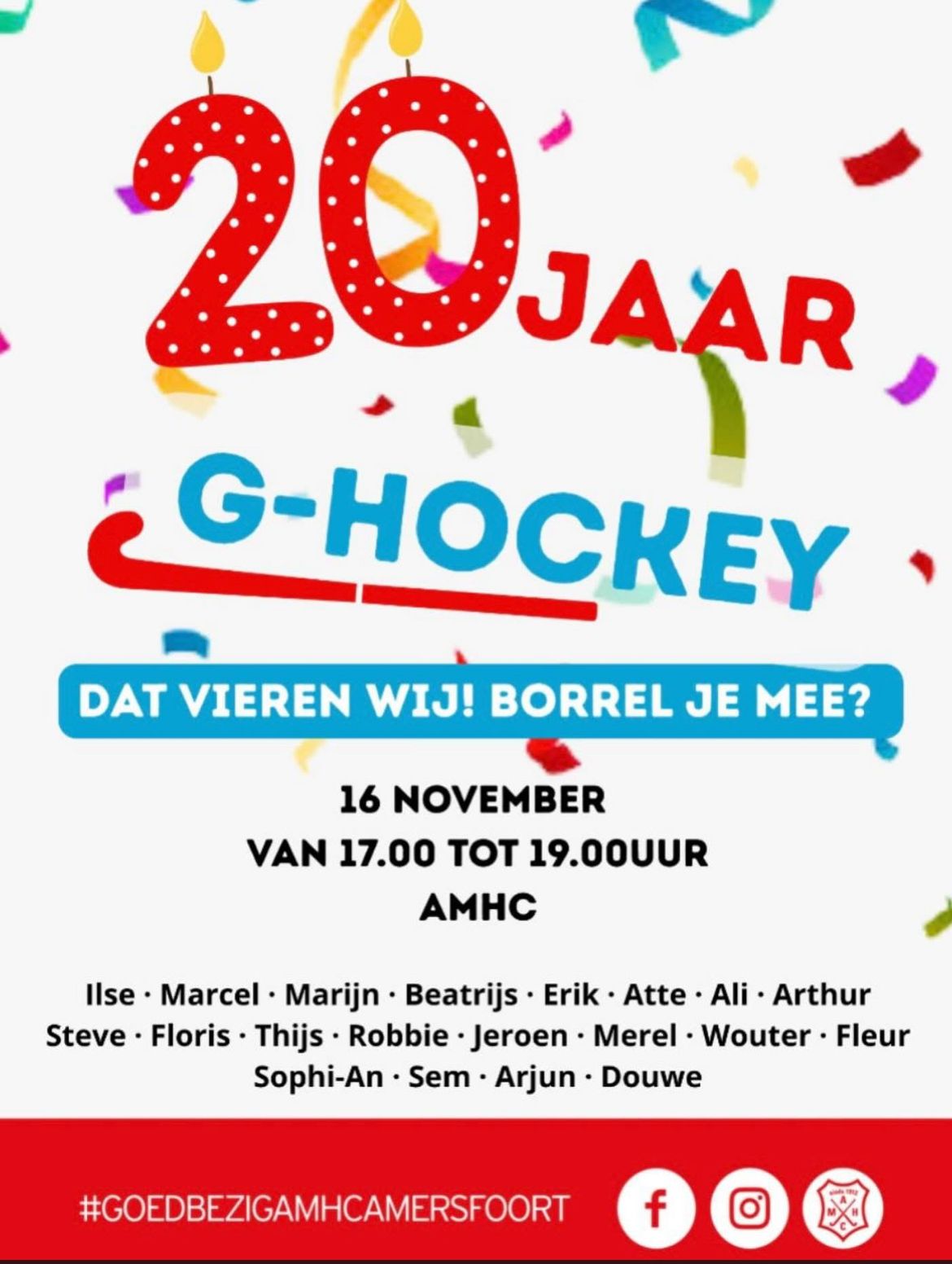 Op 16 november van 17.00 tot 19.00 uur vieren we het 20-jarig lustrumfeest van de G-hockeyres.